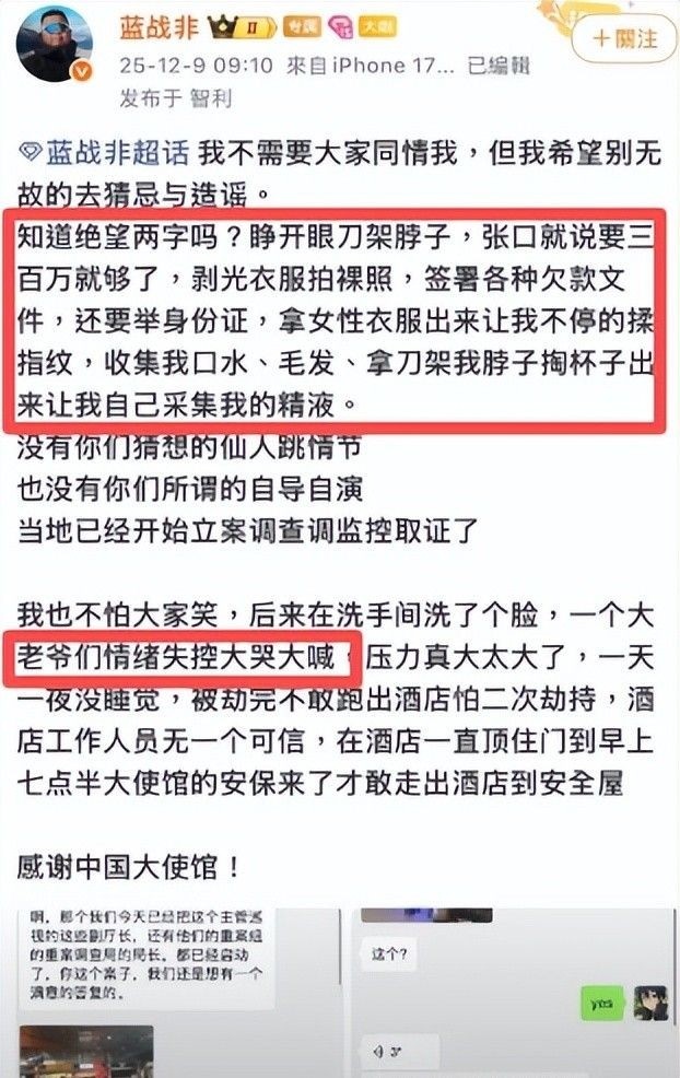 18. 直日,蓝战非再度发声,强调自己并不需要同情,但恳请公众停止毫无根据的揣测与恶意造谣。同时,他晒出了部分与酒店、警方沟通的聊天截图以及相关证据链,力证事件真实性。
